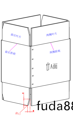 C正方箱的(de)前(qian)后內葉(ye)片(pian)與兩(liang)側(ce)外葉片(pian),尺寸通(tong)常一(yi)樣(yang),一(yi)定(ding)要切(qie)斜口(kou)處理才好成型(xing)。
