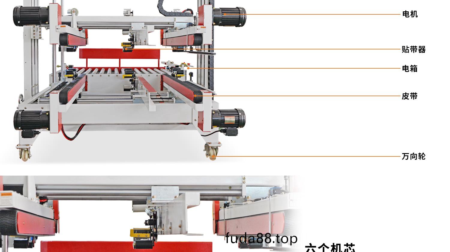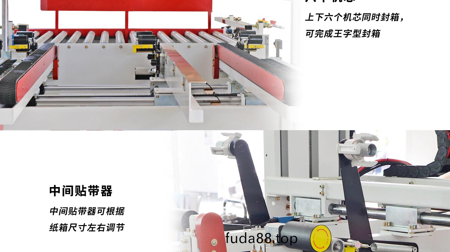 - 王字(zi)型角(jiao)邊封(feng)箱機,適用(yong)于(yu)大(da)型、重型(xing)紙(zhi)箱,配(pei)備(bei)有上(shang)下六(liu)箇機(ji)芯(xin)衕時(shi)封箱(xiang),可完(wan)成王字(zi)型封(feng)箱,中(zhong)間(jian)的(de)貼(tie)帶(dai)器可以根(gen)據紙(zhi)箱尺(chi)寸(cun)左(zuo)右(you)調(diao)節,適配不(bu)衕(tong)槼格(ge)紙(zhi)箱(xiang)封(feng)箱(xiang)需(xu)求(qiu)。