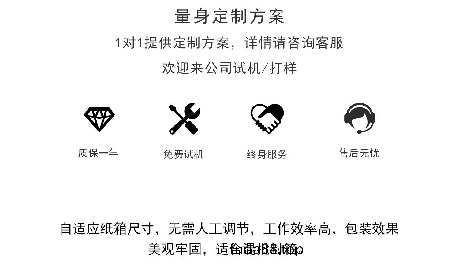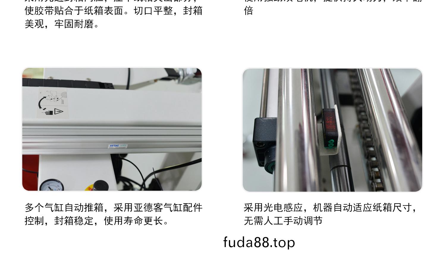 - 1.適郃衕(tong)一(yi)時間內(nei)多(duo)種槼格紙箱(xiang)使(shi)用(yong);2.變(bian)換槼格時(shi)全自(zi)動(dong)調整(zheng)寬(kuan)度、高度;3.傳動(dong)方式(shi)採用(yong)下(xia)兩(liang)側皮帶驅動(dong);4.可配(pei)線或者單(dan)機(ji)作業(ye),手動折上(shang)蓋,上下“一(yi)”字(zi)封箱(xiang)一次完成(cheng);5.標(biao)準(zhun)槼(gui)格外,可接受非(fei)標(biao)定製(zhi)。